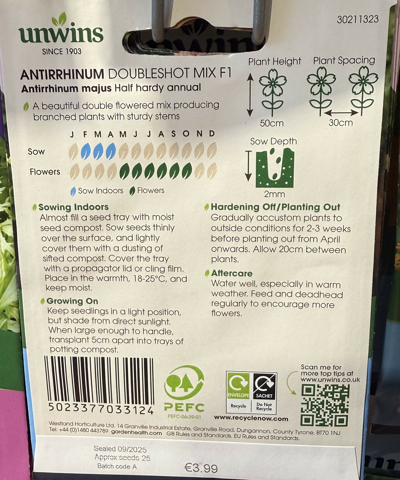 Are you looking for %name"? We offer this product in our garden centre in Ballycannon, Croagh, near Kilmallock, Charleville, Limerick, Adare and Ballingarry. You can order Antirrhinum Doubleshot Mix online or you can visit our garden centre in Ballycannon, Croagh, Limerick for more information about the product "Antirrhinum Doubleshot Mix". We look forward to seeing you soon!
