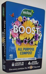 Westland Boost All Purpose Compost is our unique, specially blended compost to support the health of container plants. Peat free, enriched with starter feed and with our moisture lock technology it makes watering more effective and easier too. This compost is perfect for all containers and baskets, giving them the boost they need for stunning, vibrant floral displays. The Moisture Lock Technology helps reduce plant stress, and gives you more abundant blooms, as well as brighter colours and glossier foliage. This technology incorporates water-storing granules that efficiently retain moisture, while an added surfactant ensures easier rewetting, maintaining optimal hydration levels for your plants. This West+2 wood fibres help reduce drying out yet this compost requires less watering than the average peat reduced and peat free composts.