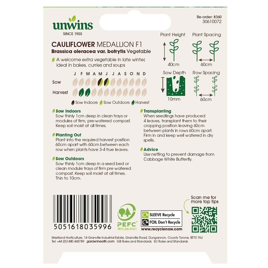 Are you looking for %name"? We offer this product in our garden centre in Ballycannon, Croagh, near Kilmallock, Charleville, Limerick, Adare and Ballingarry. You can order Cauliflower Medallion F1 (Organic) online or you can visit our garden centre in Ballycannon, Croagh, Limerick for more information about the product "Cauliflower Medallion F1 (Organic)". We look forward to seeing you soon!