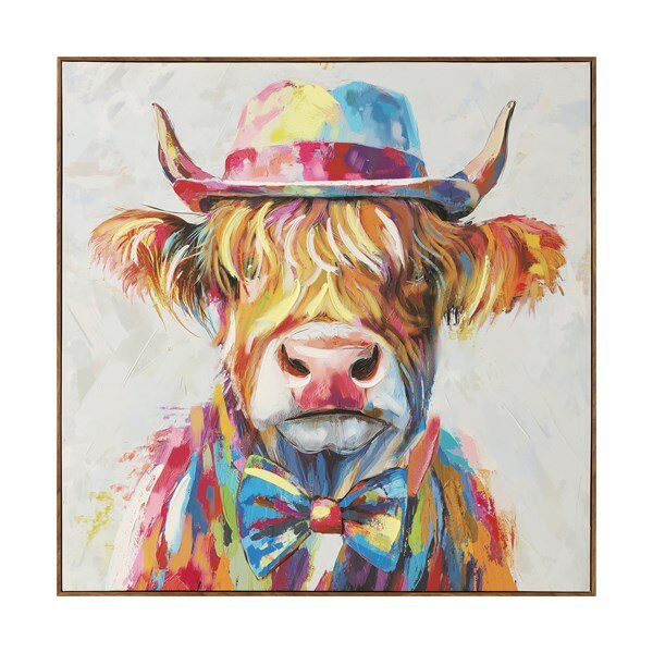 A bold and whimsical artwork featuring a charismatic Highland cow, this canvas brings a splash of personality and colour to any space. The cow is front and centre, its shaggy coat rendered in vibrant, textured brushstroke.