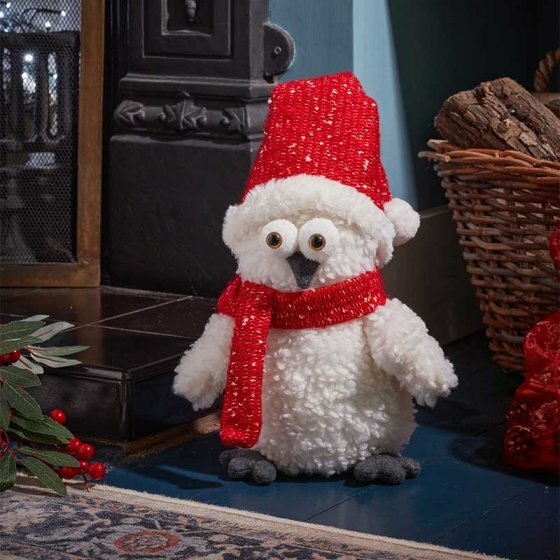 This adorable plush owl, decked out in a cheerful Christmas hat and snug scarf, is ready to bring warmth and charm to your holiday season.