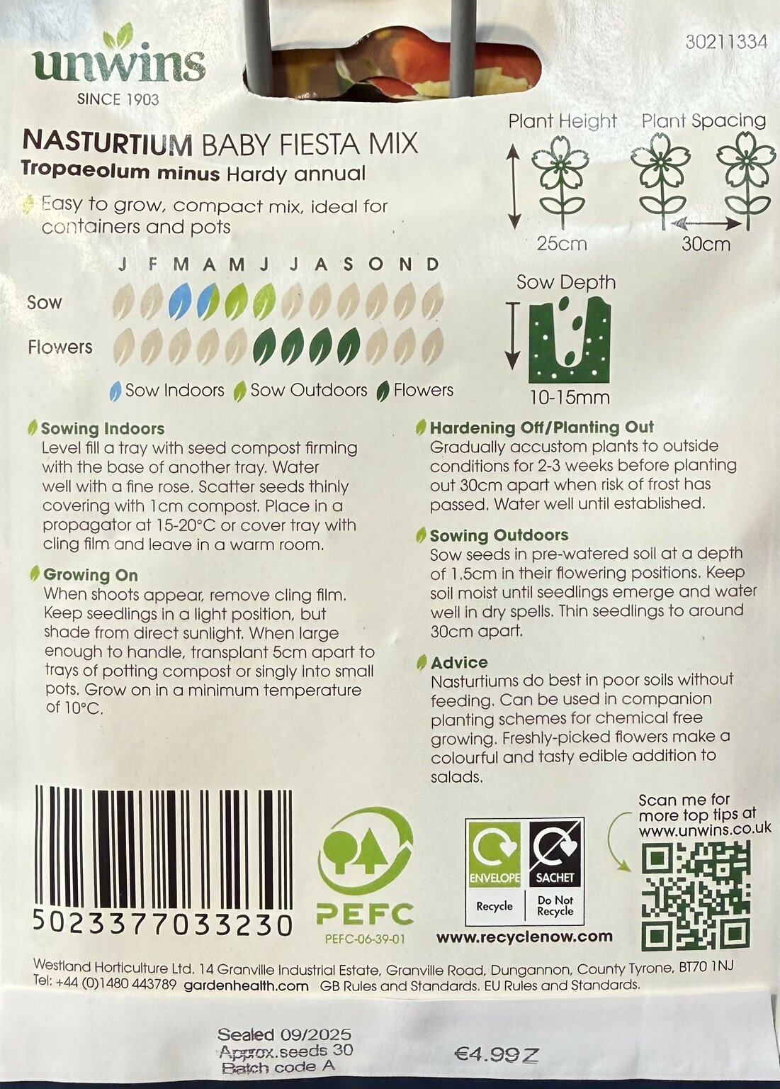 Are you looking for %name"? We offer this product in our garden centre in Ballycannon, Croagh, near Kilmallock, Charleville, Limerick, Adare and Ballingarry. You can order Nasturtium Baby Fiesta Mix online or you can visit our garden centre in Ballycannon, Croagh, Limerick for more information about the product "Nasturtium Baby Fiesta Mix". We look forward to seeing you soon!