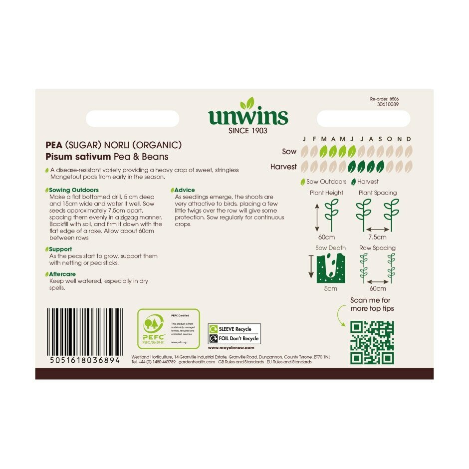 Unwins Organic Sugar Pea Norli are deliciously sweet with flat pods. A stringless mangetout that you'll get early in the season.