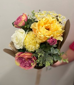 - Luxury faux flowers, carefully arranged by us and lovingly packaged in decorative paper and a satin ribbon.