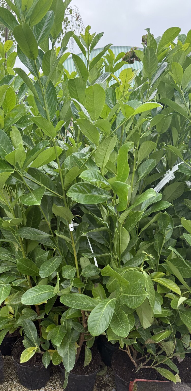 Prunus laurocerasus ‘Rotundifolia’, commonly known as Cherry Laurel, is one of the most popular and reliable evergreen shrubs for hedging and screening. With its large, glossy, rounded leaves and dense growth habit, it creates an instant sense of privacy and structure in the garden.