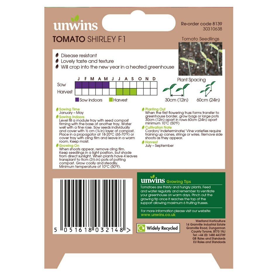 Unwins Round Tomato Shirley F1 Seeds are an RHS award winning variety of tomato. Lovely taste and excellent texture.